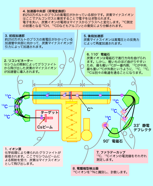 12C,13C,14Cの左肩にある12,13,14は原子の重さを表す数字です。12Cが最も軽く,14Cが最も重いことを表しています。加速器質量分析計では,この重さが異なる点を利用し,12C,13C,14Cを分離して,それぞれを測定します。また,14Cと同じ重さをもつ14N(窒素)や分子型イオン(13CH,12CDなど)とも識別して14Cを測定します。
